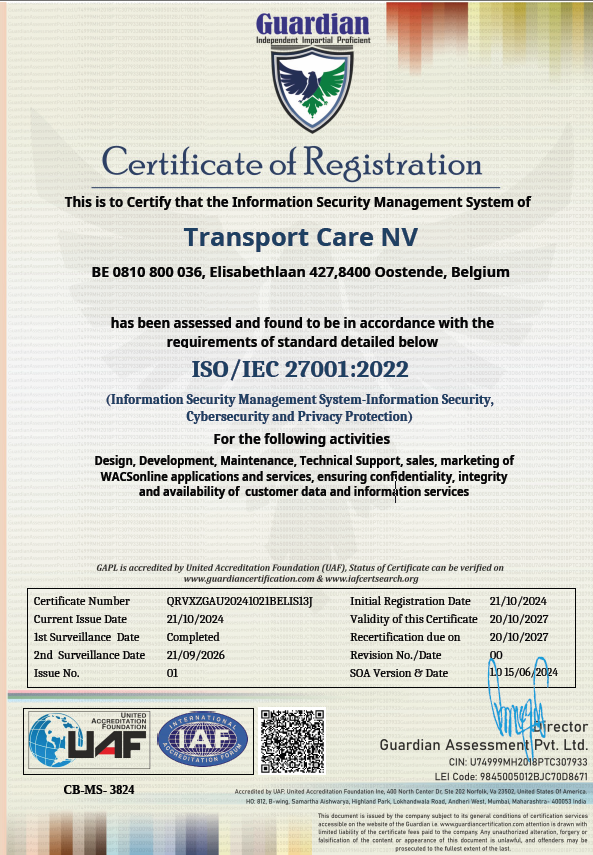 Le certificat et plus d’informations sont disponibles via notre Trust Center : https://transportcare.eu.trust.site/